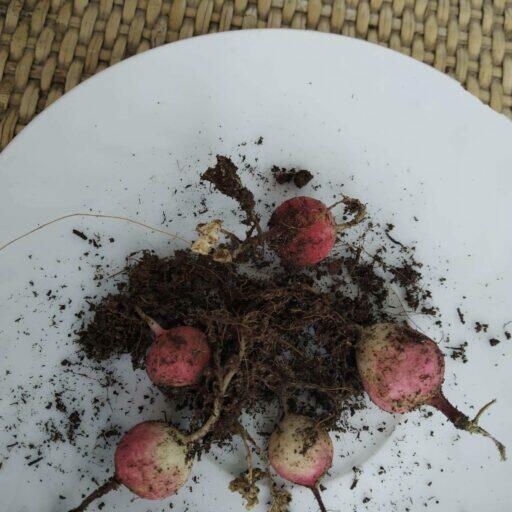 Quand je les ai déterrés, j’étais atterrée à la vue de mes minuscules rares radis. Ils sortaient un peu de terre. Leur boursouflure m’avait laissée entrevoir l’espoir d’obtenir de jolis radis généreux. Je me suis trompée.